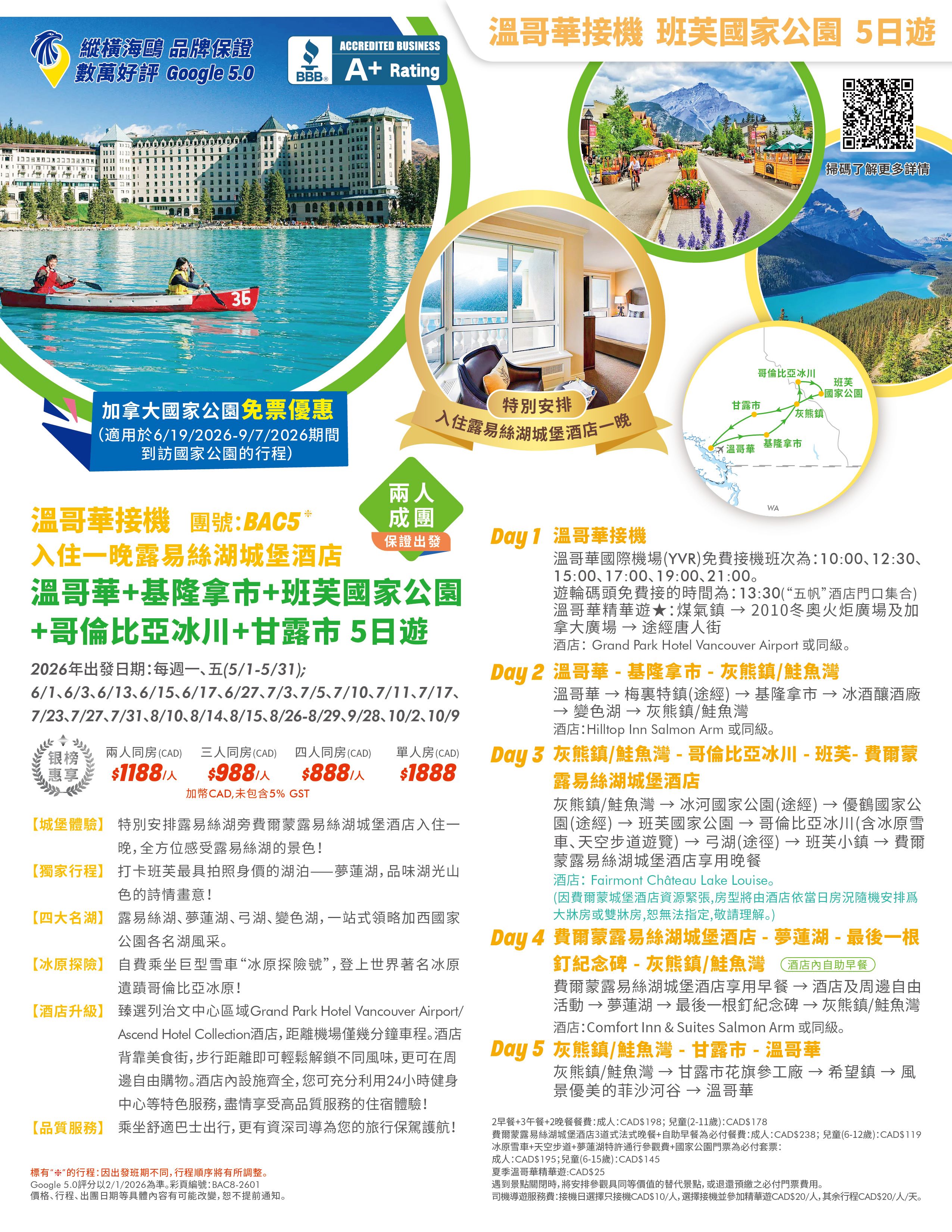 基隆拿+班芙+哥倫比亞冰川+自由行 特別安排入住費爾蒙酒店,全方位感受露易絲湖